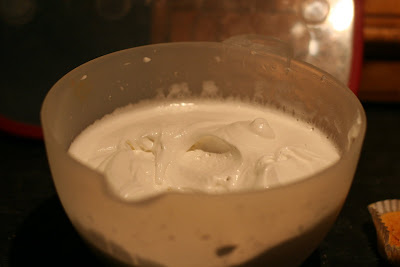 Okay, so we put the sugar into a pan, cover with water (about 150ml) and leave to boil. It will thicken and turn syrupy eventually, but in the meantime get whisking your egg whites, stop when they start to thicken and become frothy. Put aside and attend to the sugar syrup. It needs to reach 'soft-ball stage', you can either use a sugar thermometer or test by putting a few drops of the syrup into a bowl of cold water, the syrup is ready when the water-submerged syrup forms a ball shape. It should be looking fairly viscous and bubbly at this stage.