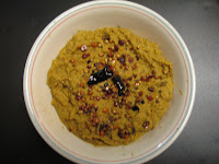 Once the cooked veggies are cooled transfer them to a blender and add salt ,dry mint and half the seasoning to it and blend well.Remove the blend chutney into a serving bowl and top it with the remaining seasoning.