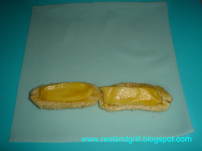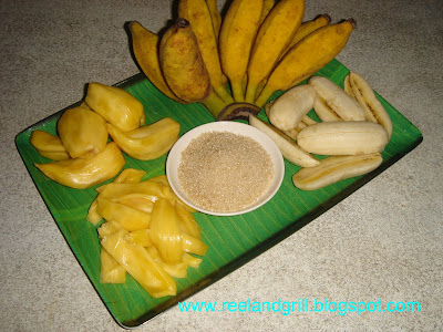 To cook ?turon?, the following few ingredients are needed: 1 hand (?piling?) ripe cooking banana, ?saba? variety when in the Philippines and ?seeni kesel? for me since I?m in Sri Lanka, peeled and halved lengthwise, several pieces of ripe jackfruit flesh, seeded and cut into strips, ½ cup brown sugar and 1 cup vegetable oil for frying.