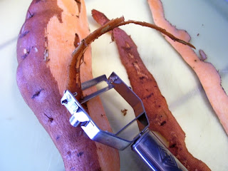 Peel the yams with a good vegetable peeler to make the strips. Save the yams for another dish.