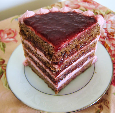 To assemble cake, place a layer of cake on a plate, and spoon a heaping 1/2 cup frosting over, almost to the sides, then top with 2 Tbsp jam, and another cake layer and repeat. Top with another cake layer, another frosting layer, jam layer then the top cake layer. Spread the frosting over the top and the sides of the cake, then spoon about 2-3 Tbsp jam onto the top of the cake and spread to about 1 inch from the sides. Place remaining frosting in a pastry bag, and pipe some of it decoratively on top of the cake and at the base. Chill the cake at least a few hours to set filling before serving.