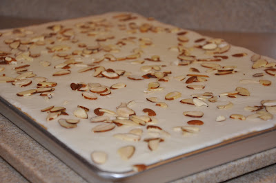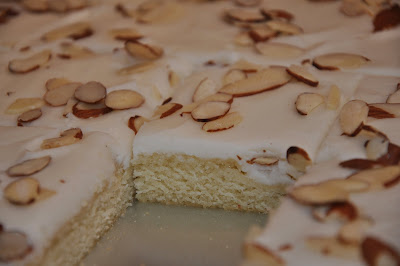 This is definitely not your typical Texas Sheet Cake. The original recipe calls for walnuts mixed in with the frosting prior to pouring over the warm cake. I opted to sprinkle with sliced almonds after frosting the cake to complement the almond flavoring.